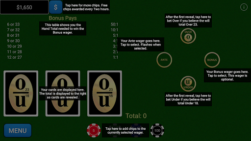Casino Over Under is based on the over/under concept that has long been a staple in sports gambling. It's a fast paced game where the player is dealt just three cards per hand which determine the outcome. It has a house advantage so generous that it is clearly going to the best option available for players hoping to have a good day against the house. The game also has an exciting bonus option that pays odds as high as 50 to 1. The app was created to introduce the game to the public and catapult the game into actual live casinos. The mission was a success! Get your free practice now!